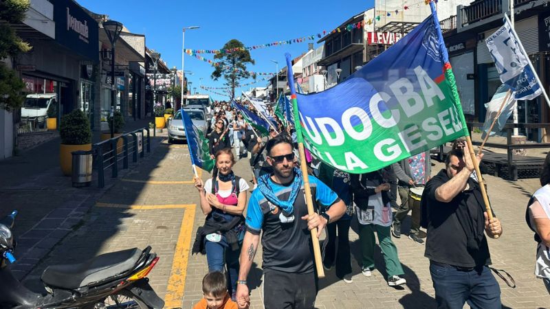 La convocatoria en nuestra ciudad la realizaron todos los gremios (AMET – FEB – SUTEBA – UDOCBA). La concentración fue esta mañana en avenida 3 y paseo 107 y desde ahi marcharon hasta la plaza Primera Junta.